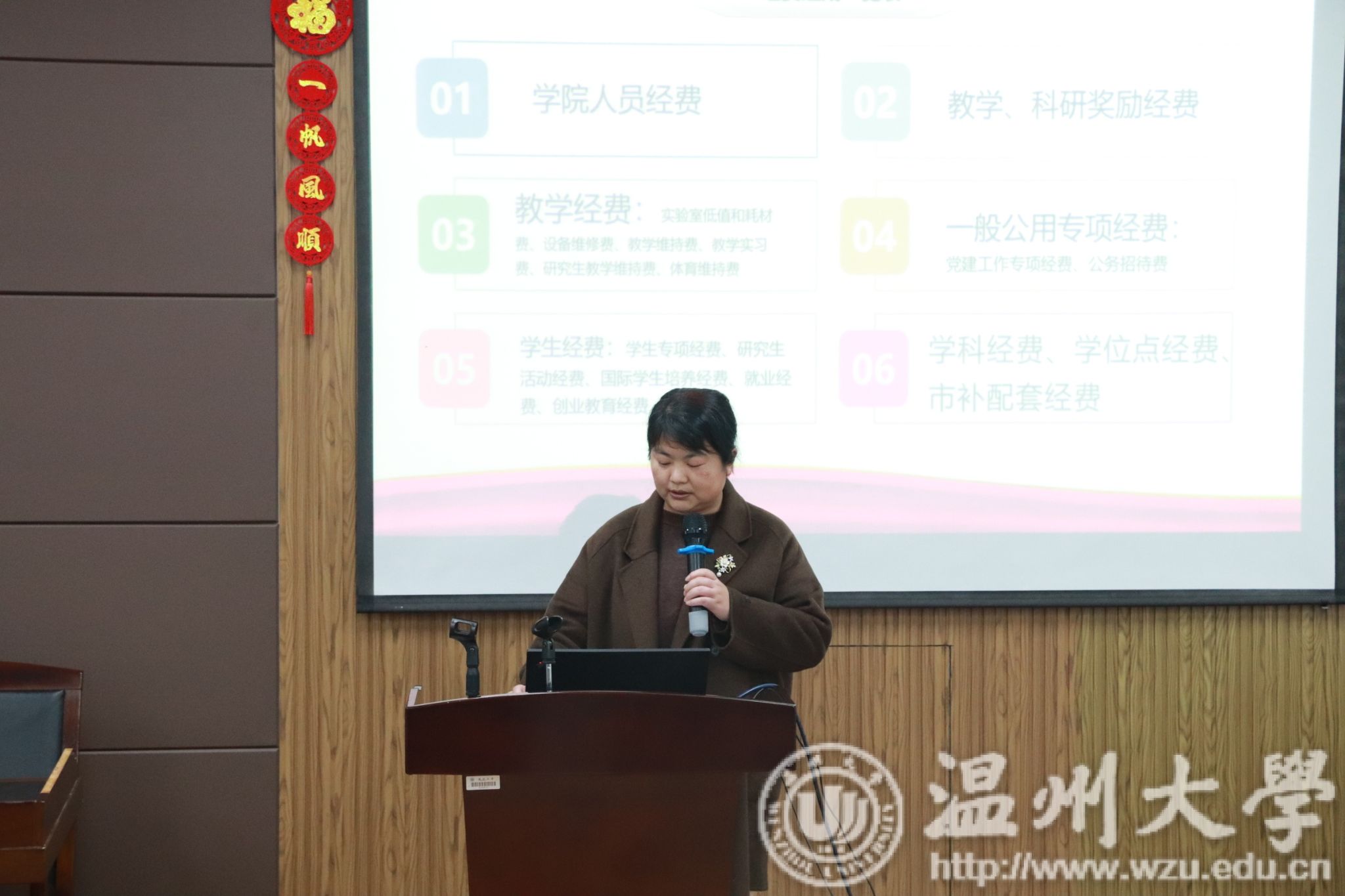 办公室主任董幼青对2023年学院的财务收支情况进行了汇报。学院财务状况运行平稳,执行力好,高效完成学院年初预算,有力地支持了学院教学、科研、管理等各项工作。