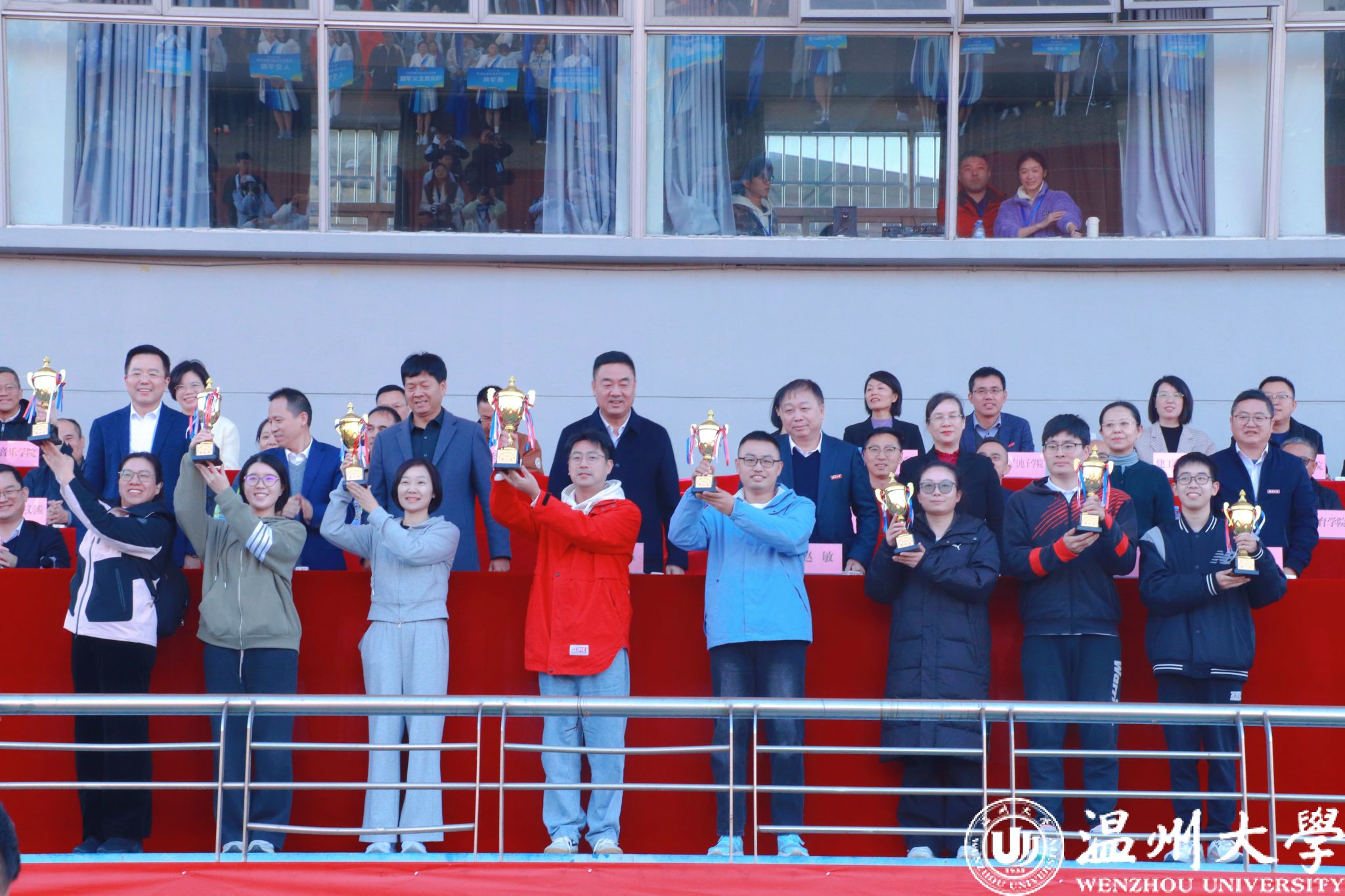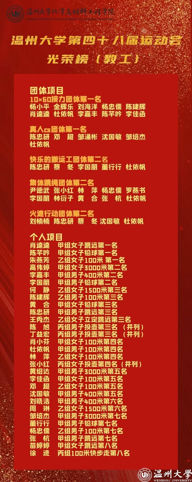 比赛哨声吹响,平日里执掌教鞭、埋首科研的老师们化身活力健儿,在跑道挥洒汗水、田赛奋力拼搏,充分展现化材人敢闯敢拼、锐意进取的精神风貌。参赛教师彼此鼓励、默契配合,赛出水平更赛出风格,将学院向心力与团队精神展现得淋漓尽致。最终,学院教工队斩获 5 项冠军、6 项亚军、7 项季军,这座沉甸甸的团体第一奖杯,凝结着运动健儿的拼搏、拉拉队员的呐喊与后勤团队的付出,更以生动实践诠释 “更高、更快、更强、更团结” 的奥林匹克格言与 “三全育人” 综合改革理念。